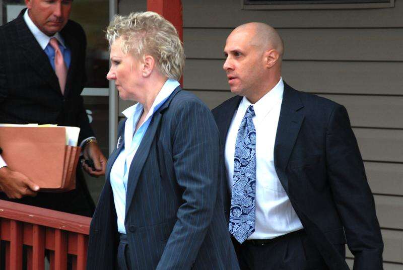 Ron Gower/TIMES NEWS Michael T. Degilio, right, a psychologist with a practice in Mahoning Township, leaves the office of District Justice Edward Lewis in Jim Thorpe following a hearing yesterday that he allegedly sexually assaulted a female patient in February 2009. The charges against him were bound for Carbon County Court. Woman in front of Degilio is a friend of his.