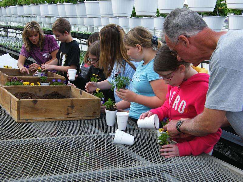 CAROL ZICKLER/SPECIAL TO THE TIMES NEWS The Slatington Elementary School, through the Penn State Master Gardener Program, visited Sensinger's Greenhouse to learn more about Mother Earth. Master gardeners Lisa Hiles, background, and Ed Knittle, foreground, assist fifth and sixth grade students in planting violas.