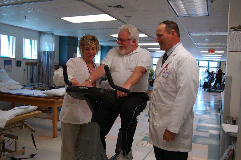 CHRIS PARKER/TIMES NEWS Ron Fritz of Lehighton gets in shape for spring at the Cardiac and Pulmonary Rehabilitation center at Gnaden Huetten Memorial Hospital. He's shown here on a stationary bicycle between physical therapist Gary Higgins, who is Director of Rehabilitation Services, and Lisa Pompa, Supervisor of Cardiac and Pulmonary Rehabilitation.