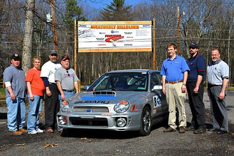 VICTOR IZZO/SPECIAL TO THE TIMES NEWS Gathered near the starting line of the Weatherly Hill Climb for a check presentation in support of the Weatherly Pride Relay for Life Team are, left to right : Weatherly Mayor Tom Connors; Weatherly Pride Relay for Life Team Captain Michele Connors; Richard Kane, Vice President of the Weatherly Hill Climb Association; Joe Cyburt, Councilman and President of the Weatherly Hill Climb Association; Al Corazza, Fairway Subaru Driver; Jason Barnhardt, Manager of the Firestone store in Hazelton; and Fred Grant, Division Manager for DeAngelo Brothers Inc. of Hazleton. In the center is the Hill Climb vehicle of the event's main sponsor Fairway Subaru of Hazleton.