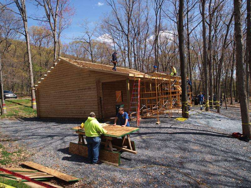 To serve the park's campgrounds, that can draw upward of 1,000 visitors on a popular weekend, the new camp store will provide camping supplies like charcoal and tarps; foodstuffs like bread, milk, eggs and condiments; and snacks like ice cream and soda.The $100,000 building began in the spring of 2009. Awards were made to Kuhns Brothers Log Homes for a kit of materials to build the 42-foot by 26-foot building with an 8-foot by 42-foot front porch, and to Jimmy Marks Masonry for the foundation."There's a big need for it now that we have 13 cabins that are always rented, plus 120 tent sites and four group sites," said Rick Johnson, site coordinator at Mauch Chunk Lake Park.The building is constructed of solid 6-inch by 8-inch-thick logs. During the week of April 19, crews from Mauch Chunk Lake Park and Eckley of the Pennsylvania Conservation Corps, and members of the Mauch Chunk Lake Park Maintenance Department, installed the plywood roofing panels and black paper.The roof will be finished with a metal roof.Because the camping season is already under way, the crews have to address normal maintenance demands, so they are able to work on the camp building only two or three days a week.