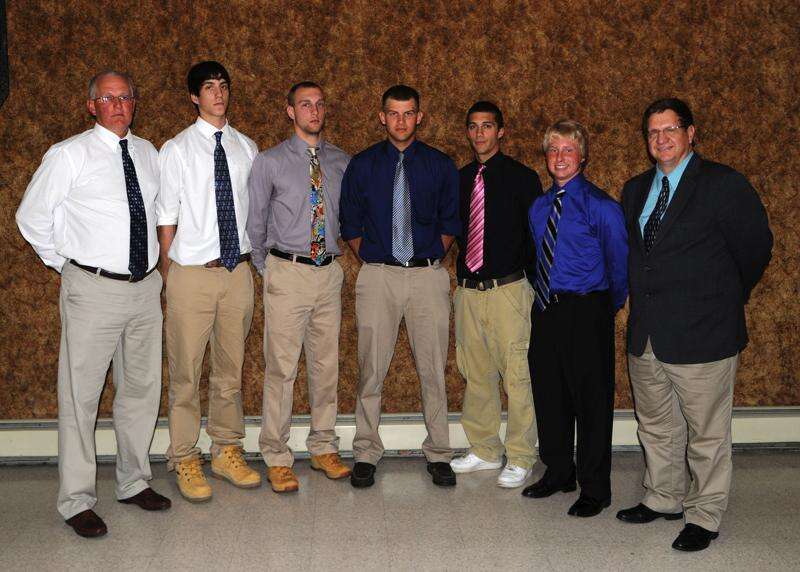 The Colonial League champion Northern Lehigh boys basketball team was honored at recent banquet. The Bulldogs beat Notre Dame, 46-43, in three overtimes for the Colonial League championship. The team, which had five senior members, finished the season with a 19-6 record. Shown from left are head coach Rich Oertner and seniors Nick Pappas, Evan Biegley, Joe Seremula, Marty Everhart and Bobby Hahn. At right is guest speaker Keith Groller of the Allentown Morning Call.