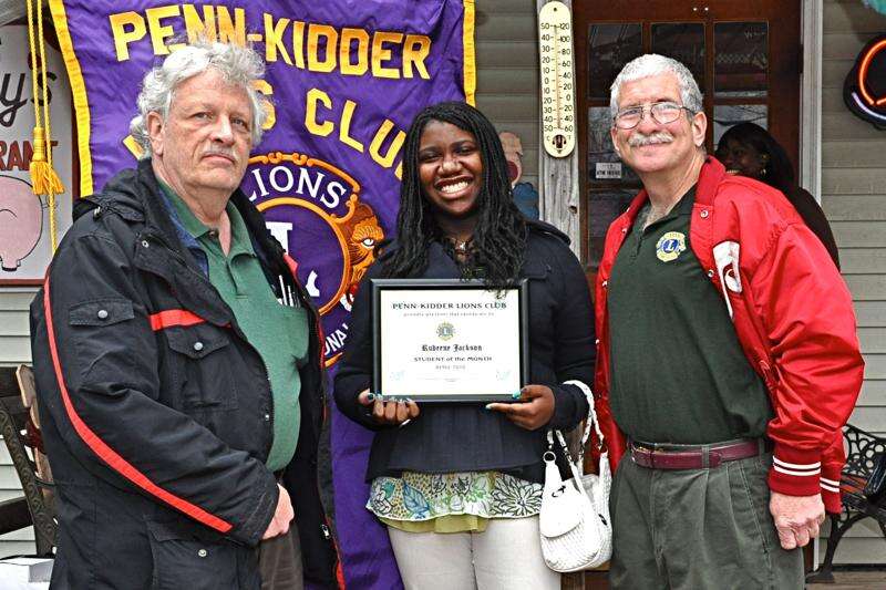 The Penn Kidder Lions Club honored Rudeene Jackson as the Student of the Month for April 2010 at a dinner and meeting at Piggy's Restaurant in Lake Harmony. Rudeene, who is an eighth gradestudent at the Penn Kidder Campus of the Jim Thorpe Area School District, is pictured after the dinner with Past Lions President Brad Grissinger (left) and Penn Kidder Lions President Frank Rossino. Rudeene is the daughter of Pamela Wakefield.