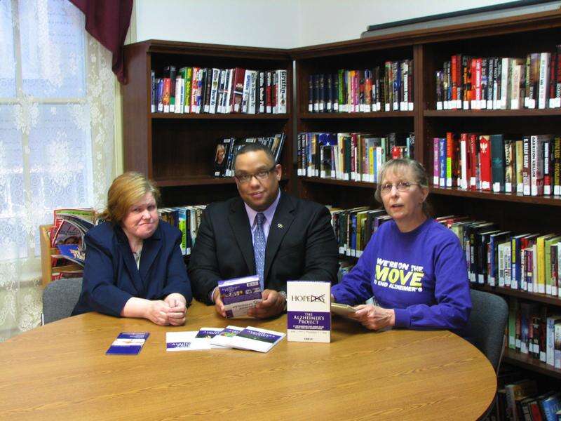 SPECIAL TO THE TIMES NEWS Debi Dodson, director of the Panther Valley Library, accepts Alzheimer DVDs and book from Clay Jacobs, outreach and education coordinator for the Greater Pennsylvania Chapter of the Alzheimer's Association, as Patti Anglovich, daughter of Frank E. Ruff, looks on.
