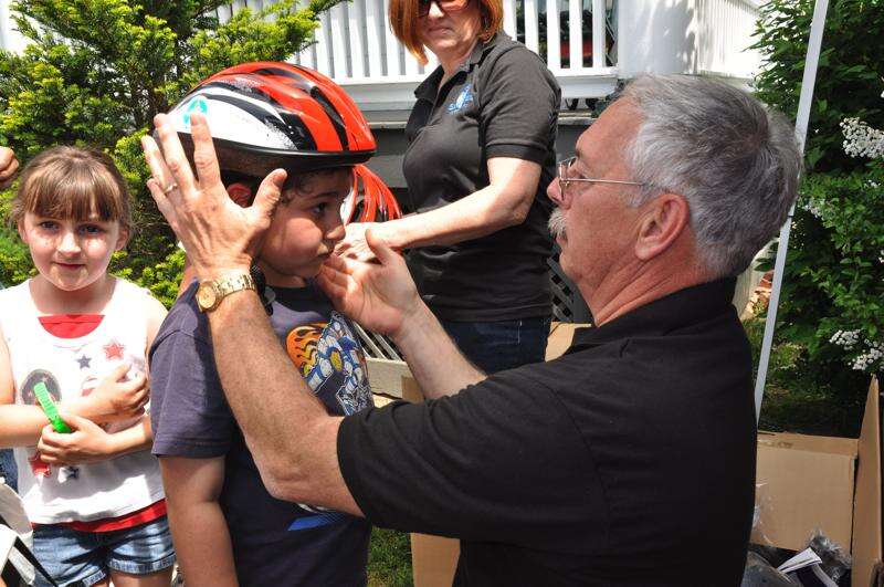 AMY ZUBEK/TIMES NEWS Carbon County Commissioner Wayne Nothstein fits Robert Kneller, 6, will a free helmet at the fourth annual Carbon County Children's Fun-N-Safety Fair on Saturday. The free event provided children and families with the opportunity to learn about numerous safety issues.