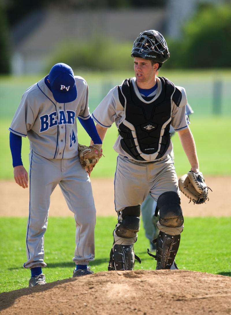 bob ford/times news Pleasant Valley pitcher Russell Baldino and catcher Joe Wiesmatch talk on the mound during a recent baseball game. The Bears' baseball, softball and soccer teams are all enjoying outstanding success this spring.