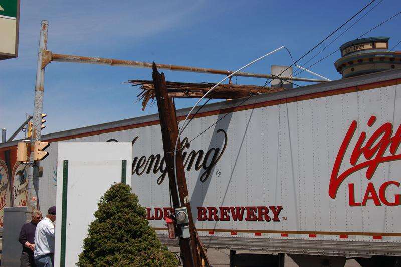 Tamaqua Police said the truck, driven by John J. Petrovich, Jim Thorpe, was traveling east on Route 209 (Broad Street) and was attempting to turn right to travel south onto 309 (Center Street). Petrovich told police that a car turned in front of him and that he tried to miss hitting it. The truck, owned by Bill Weaver, Coaldale, bumped into the car and also hit the pole, which was on the sidewalk in front of the M&T Bank parking lot, snapping off the top of the pole.No one was injured at the scene. Once the truck was removed, PPL Utlities took care of the pole.The accident, which occured around 12:15 p.m., slowed traffic through the busy intersection. Tamaqua Fire Police assisted in directing traffic through the site.