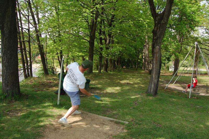 Yet, that's part of the allure that continues to attract participants to the Victory Park Open Disc Golf Tournament in Slatington.Sponsored by the Slatington Parks and Recreation Commission, the fifth annual event held recently had 45 entrants, said chairman Robert Stettner."This is the most ever," Stettner said. "I attribute it to the weather and good word-of-mouth."Stettner said those who participate in the event genuinely seem to enjoy it."People are glad we have this event," he said. "They get to see a lot of familiar faces."The nine-hole, 18-tee course consists of one round of golf. The course was designed by disc golf pro Dr. John Duesler of Disc Golf Services in Huntingdon Valley, Montgomery County.Also referred to as frisbee golf, the objective of the game is for individuals to throw a flying disc into a basket.George Buckland, of Fogelsville, was all smiles after he shot a birdie on hole No. 17."It's great, and you get to meet some new people," Buckland said. "It's available for anybody."His son, Sam, 10, said the sport was "fun to watch."Jim Miller of Slatington said the activity is a great all-around event."I would say the course is average difficulty, because you have a lot of obstacles," Miller said. "Patience is the key, and not getting upset when you hit a tree or go out of bounds."The event consisted of several categories: ages 17-and-under, 18-39, 40-and-over, and a pro category. Trophies were given out for first, second and third place performances.Proceeds raised go toward Slatington Recreation Commission projects, said Stettner, who added the event is a strong attraction for the borough."The goal was to fix up and renovate Victory Park along with beach volleyball to give the residents more activities to do," he said. "And it brings people to the area."