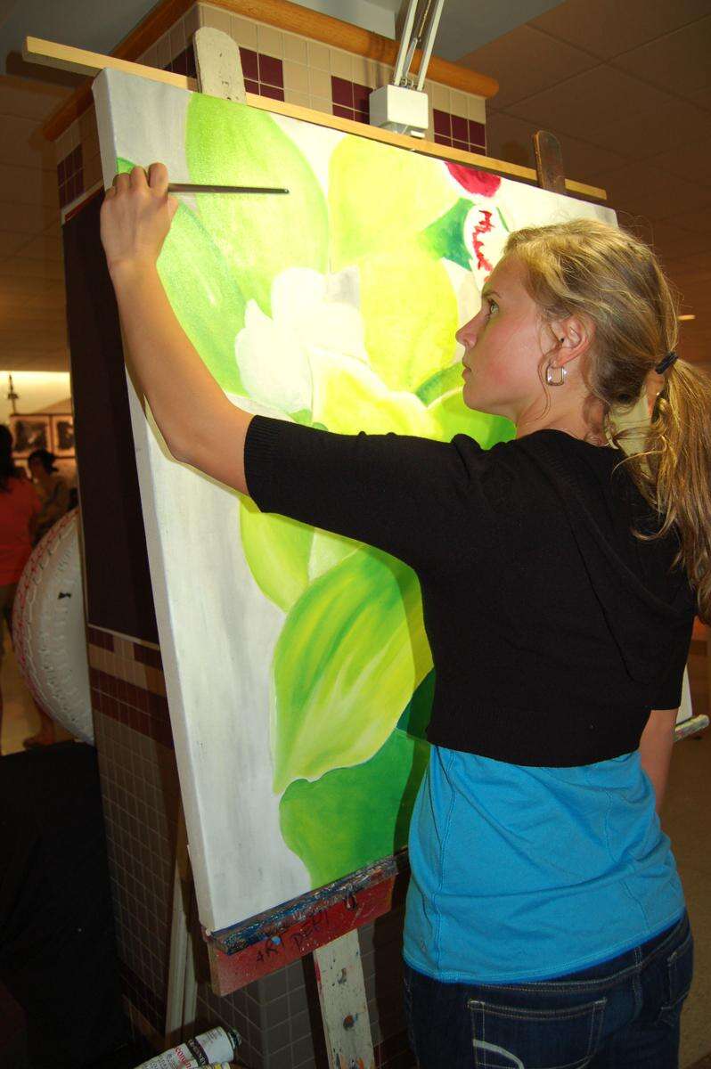 Tiffany Harleman, daughter of Dave and Ann Harleman, and a senior art student at Lehighton Area High School, presents herself at her work during the annual art show held Thursday night at the high school. She is planning to study physical therapy at Lebanon Valley College.