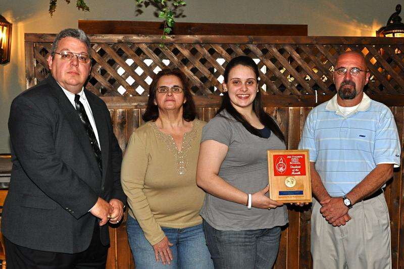 The members of the Jim Thorpe Lions Club honored Alysa Gavornik as Student of the Month for April 2010 during their monthly meeting at Flagstaff Park recently. Alysa, a student at Jim Thorpe Area High School, is pictured with, left to right, Jim Thorpe Lions Club President Ron Sheehan; her mother Theresa Seliga; Alysa; and Jim Trainer, Jim Thorpe Lions Club Vice President.