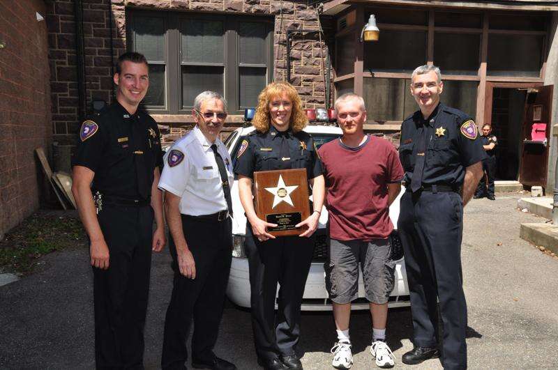 Lt. Karen Flexer, center, of the Carbon County Sheriff's Department in Jim Thorpe was honored by her peers recently for her 10 years of service in the department. During a special luncheon on Friday, Flexer was presented with a plaque from Sheriff Dwight Nothstein, second from left, that recognized her hard work and dedication to Carbon County. With them are, from left, Lt. David Midas; Nothstein; Flexer; her husband Randy Flexer; and deputy sheriff Joseph Hager.