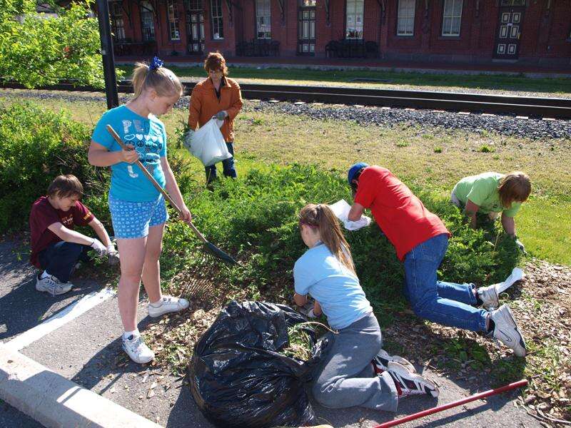 Members of the Tamaqua Lions Club and LEO Club volunteered their time recently to spruce up the Depot Square Park lot grounds. Pictured from left are LEOs Michael Breeden, Bethany Moore, Lion and LEO Advisor Sue Dolan, LEOs Morgan Miller, Timothy Lehman, and president Eric Zeigler.
