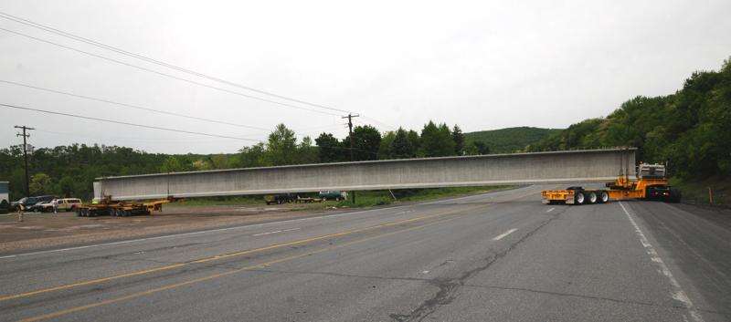 Motorists had a long wait Monday morning when crews attempted to deliver two mammoth 165-foot concrete bridge beams to a construction site on the Northeast Extension of the turnpike. It took many maneuvers to make the turn at the intersection of state routes 309 and 895 in the village of Snyders, West Penn Township. The beams reached their final destination as they passed through the toll booths of the turnpike. Walsh Construction is replacing two bridges which span the Lehigh River and the Parryville Dam.