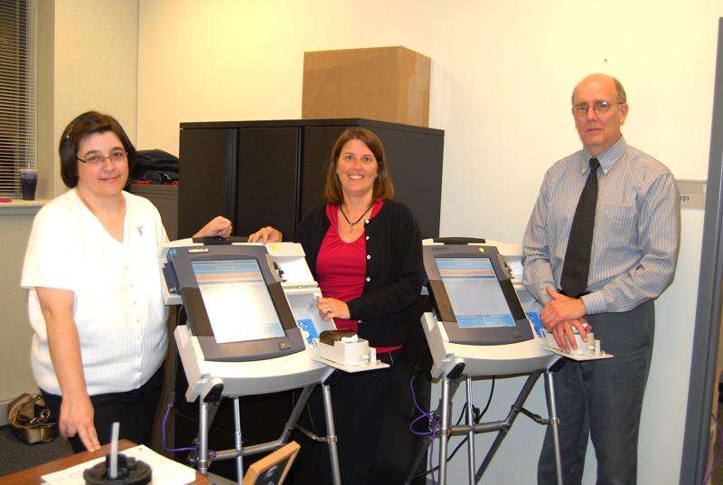 Kenneth Leffler, right, who ran elections for three decades in Carbon County as director of the Election Bureau before retiring in 2009, came out of retirement to assist with yesterday's voting. Serving as acting director, Leffler looks over tabulating computers last night in Jim Thorpe with, left to right, Jane Krebs, department clerk, and Lisa Dart, temporary clerk.
