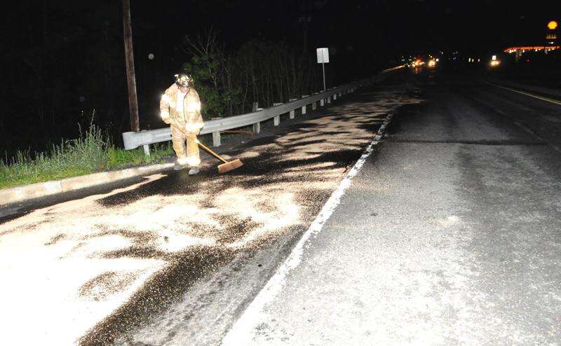 A major fuel oil spill closed the two northbound lanes of state route 209 in Franklin Township early this morning. The incident began shortly before 3 a.m. when a tractor trailer owned and operated by New England Freight struck a floor jack which was lying on he road. The jack apparently flew up puncturing at least one of the two saddle tanks of the rig. The two lanes were covered in fuel oil. Members of the Franklin Township Fire Company utilized truck loads of absorbent material in an effort to stop the spread of the fuel which was making its way to the Pohopoco Creek. Franklin Township firefighters were later joined by PennDOT work crews in cleaning up the mess. The site was just a short distance from the entrance to the Pennsylvania Turnpike.