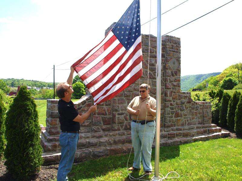 An annual flag raising was held at the West Bowmans War Veterans Memorial at Marvin Gardens in West Bowmans, East Penn Township. The event was held by members from the East Penn Township Parks Commission (EPTPC). Taking part in the ceremony were, from left, EPTPC Vice President Hal Resh Sr. and President Bill Schwab. Last year, a large dedication service was held at the memorial, which was moved to this location, thanks to the efforts of Lehighton Area High School senior Hal Resh Jr. and other volunteers. For the move, the memorial was disassembled stone by stone. More than 1,000 were marked and put back together at the new location in West Bowmans. Resh Sr. said, "It was a community project that everyone helped accomplish."