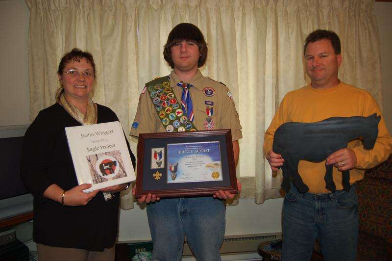 Wingert, son of Scot and Judy Wingert, chose to design, build and install six markers on the Lehigh Canal from Weissport to Jim Thorpe. The markers are positioned each mile and half mile.A commemorative sign for the Weissport pavilion was also made in memory of Dr. and Mrs. Wlliam Feldbaumer, who donated the funds for the pavilion. Other funds for the overall project were donated by Wingert's family and friends.The pavilion at Weissport is a pleasant place to rest in the shade, eat a snack at the picnic table underneath the roof or meet up with friend at the trailhead.When Wingert, a junior at Lehighton Area High School, decided to put the mile markers on the towpath, he didn't chose a simple design. While working on his project, he spent many hours designing, cutting out the design and painting the mile markers which included silhouettes of a mule. He selected the mule to be part of his project because the mule was the chosen animal to pull the coal barges to market during the historic early period of the canal.Mules were the animal of choice to pull the barges because they were considered more patient, sure-footed, hardy, long-lived than horses and were considerably less obstinate, faster, and more intelligent than donkeys.Fellow scout Tyler Helmer assisted Wingert with digging holes for the posts, which was done during a pouring rain. His father also helped in the project.Wingert began scouting as a Tiger and joined Boy Scout Troop 82 in 2004. As a Boy Scout he earned 39 badges and is a member of Order of the Arrow, Witauchsoman Lodge, No. 44. He has held positions of Troop Senior Patrol Leader, Assistant Senior Patrol Leader, Troop Guide, Scribe, O/A Representative, Quartermaster and Assistant Patrol Leader.As a Cub Scout, he attained the Arrow of Light in 2004. As a member of Boy Scout Troop 82, he attained the Scout Rank, Tenderfoot Rank and Second Class Scout in 2004. In 2005, he earned First Class and Star Scout. During 2006, he attained Life Scout.During his Scouting career, he spent 106 nights camping, 118 days hiking and compiled 197 hours of service. He also completed Scoutmaster Specific Training and Scoutmaster Outdoor Training.Wingert is a member of Trinity Lutheran Church, Lehighton, where he was presented the Eagle Scout Award during a Court of Honor held May 8.