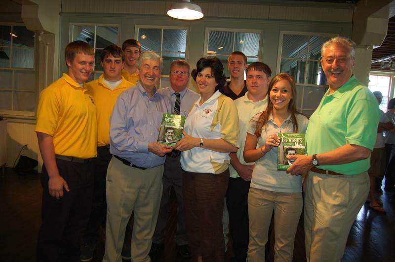 Jerry Wolman, the Shenandoah native who owned the Philadelphia Eagles of the National Football League for a number of years in the 1960's, has donated copies of his autobiography, The World's Richest Man, to the libraries of a number of Schuylkill and Lower Anthracite Region high schools. The event was held Friday, May 21 at the Shenandoah Historical Society. Students and athletic directors from Marian Catholic and Panther Valley High Schools were among those participating in the book donation event. From left are Marian football players Brett Befano, Corey Quick and Dominick Richards; Jerry Wolman, presenting his book to Marian A.D. Stan Dakosty and Panther Valley A.D. Kristin Black; Panther Valley students Kyle Picht, Andrew Tucker and Katie Zulik; and Sam Matta, event chairman.