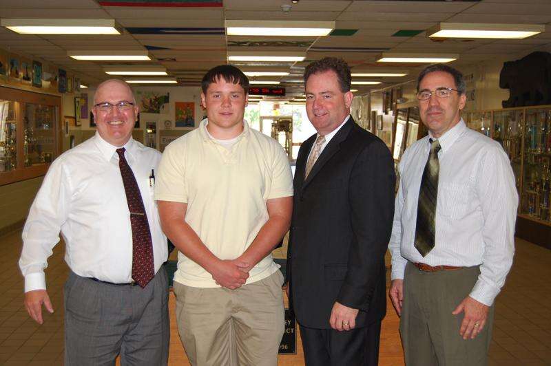 VINNY VELLA/TIMES NEWS PVHS prinicipal Joseph Gunnels, senior Andrew Tucker, Pennsylvania Speaker of the House Keith McCall and PVHS director of guidance Tim Grazio gathered May 20 to present Tucker with his award. Tucker was one of two students from across the state to recieve the House of Representatives Scholarship.