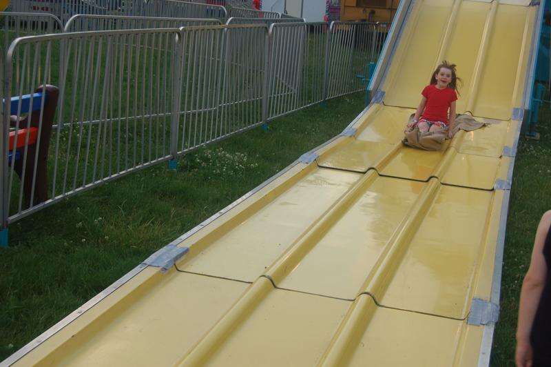 TERRY AHNER/TIMES NEWS Carissa Fallon, 7, of Lehighton, enjoys her trip down the steep sliding board Thursday at the Crusaders For A Cause Carnival in the Palmerton Borough Park.
