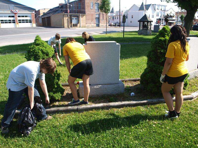 A number of 7th grade students spent part of a school day volunteering their time picking up trash at parks, cemeteries, and on streets throughout Summit Hill in preparation for Summit Hill's Memorial Day Parade scheduled 10 a.m. on Monday. Pictured pickup up litter at the Ludlow Park in Summit Hill are 7th grade Panther Valley Middle School students William Butler, Ashley Rodgers, Alexis Krestes, Samantha Schuch, and Corrin Tucker.