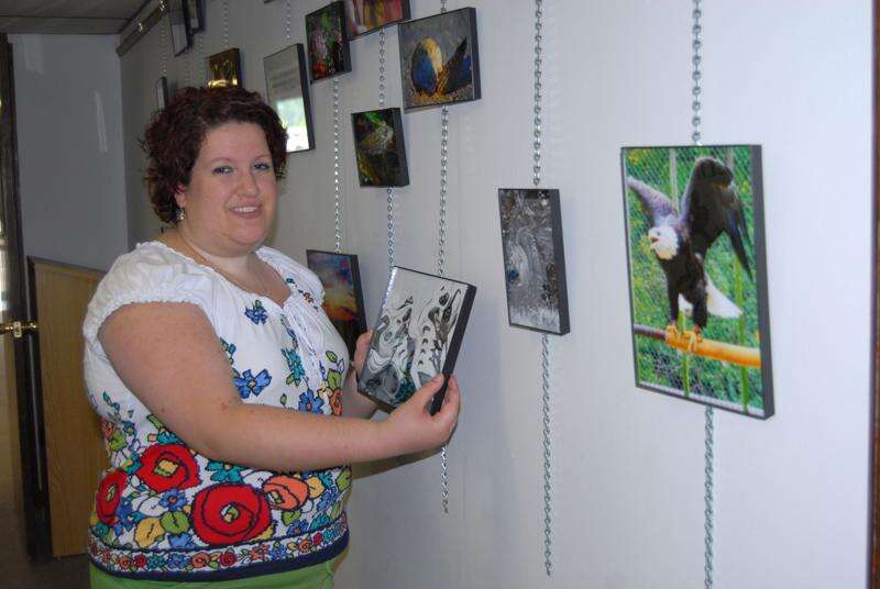 Ron Gower/TIMES NEWS Jill DeSousa of Palmerton puts together a photography display at the Carbon County Environmental Education Center in Summit Hill. The exhibit, consisting of 42 photos, will be at the Center through early August.