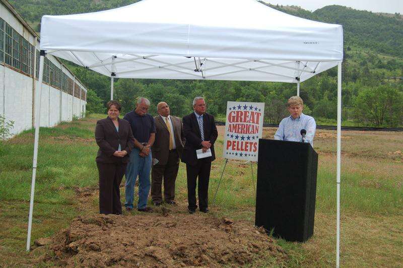 Great American Pellets, an alternative energy company that will manufacture premium hardwood pellets, held its ground-breaking ceremony on Wednesday.Located at 2115 Little Gap Rd., the company will manufacture premium hardwood pellets for use in pellet stoves to provide heat for residential properties, said Jeff Nichols, president.The business will create 14 of those jobs when the building is completed later this year, said Nichols, who added that the business has been designed to be both environmentally sustainable and economically profitable.It will also do extensive renovations, including some demolition and additions, to the 31,000-square-foot blighted building in a brown-field zone, Nichols said."We're very excited to bring new jobs to Carbon County," Nichols said. "We're bringing new jobs to the area creating clean, green energy that this country so desperately needs."Christine Verdier, chief of staff, Sen. David Argall's office, said it gives her great pleasure to know the company is "going green.""It's going to rehabilitate and revive our area," Verdier said.Nichols said the project is consistent with the Keystone Principles for Growth, Investment & Resource Conservation because it will revitalize and reuse a blighted industrial property and utilize existing infrastructure. In addition, he said over 60 percent of the materials removed during the demolition will be recycled.The manufacturing plant was designed by EcoTherm, Inc., one of the nation's leading designers and builders of wood pellet plants, which Nichols said was involved in the site selection and process design."EcoTherm designed the plant for energy and operational efficiency," he said. "It has been an integral part of our team offering its expertise on environmental and safety issues."Stephen Yokimishyn, Northeastern Regional director, Governor's Action Team, said the state provided the company with an $80,850 funding offer, coordinated by the Governor's Action Team, as well as a $770,000 loan and a $220,000 grant from the Alternative and Clean Energy program, which is administered jointly by the Department of Conservation and Economic Development and the Department of Environmental Protection under the direction of the Commonwealth Financing Authority."It's eco-friendly, and is going to restore a building," Yokimishyn said. "To some, 33 jobs over three years might not seem like much, but this 33 equals 200 or 300 jobs in other areas of the state."Nichols said the project also received support from U.S. Rep. Paul Kanjorksi, Gov. Ed Rendell, state Sen. David Argall, Speaker of the State House of Representatives Keith McCall, the Carbon County Board of Commissioners, and the Lower Towamensing Township board of supervisors.The company will use only whole trees that will be debarked and chipped to ensure that no leaves, bark or other foreign matter will enter the material stream.The clean wood chips will be stored inside to prevent absorption of excess moisture, as the chips are ground, dried and then fused under very high pressure into cylindrical pellets.The finished pellets go through screeners to remove dust and then are packed in 40-pound bags for delivery to customers.Nichols said EcoTherm suggested that the company capture all the dust from the manufacturing process, and use it to fuel the dryer instead of burning oil.
