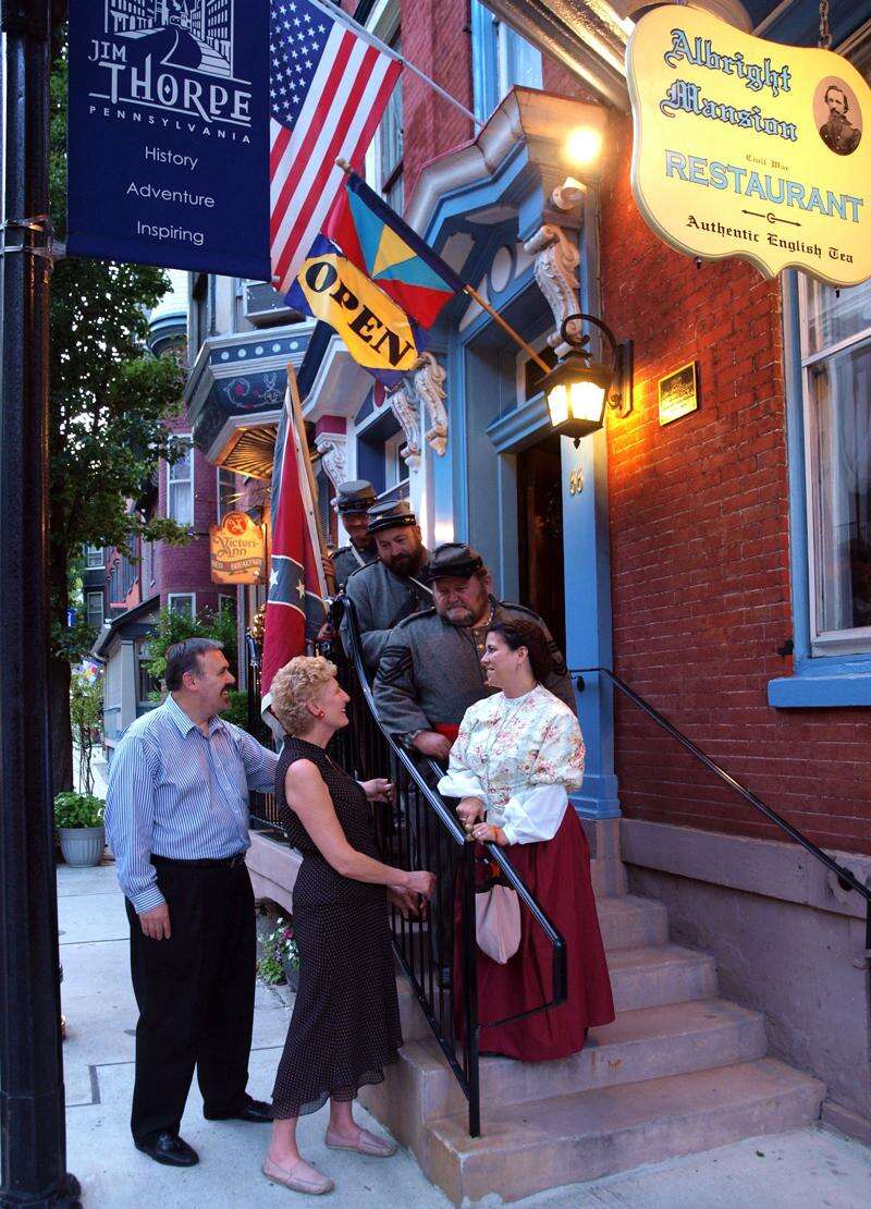Bart and Meriel Springer, owners of the Civil War-themed General Albright Mansion Restaurant in Jim Thorpe, greet Confederate reenactors who participated in a Civil War encampment last weekend in Whitehall. Representing the First Maryland Battalion are James Issermoyer (holding Confederate battle flag), Dave Chadwick, Bryan Dickinson, and Lisa Barndt.