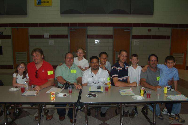 LINDA KOEHLER/TIMES NEWS Several fathers of first and second graders attended Pleasant Valley Elementary's "Doughnuts for Dads" event. Left to right: Bill Franklin with second grade daughter, Kaitlyn; Jim Magrath and second grade daughter, Willow Boyer; Richard Martes with second grade son, Brandon; Jeff Clauson with second grade son, Joshua; Michael Kaiser with first grade son, Chase.
