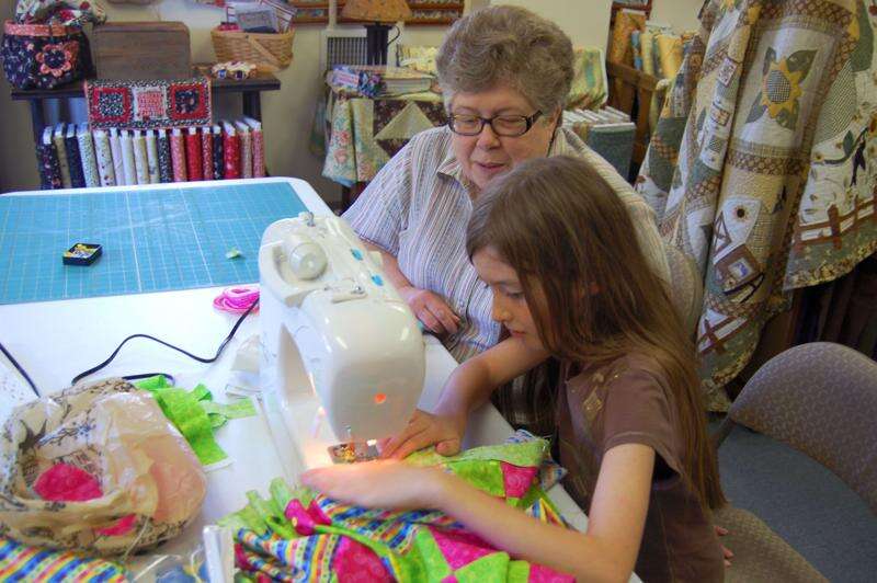 RIGHT: Jane Heckman watches over Shannon Beltz as she stitches a border onto her quilt. Shannon, who is in the sixth grade, is home-schooled.