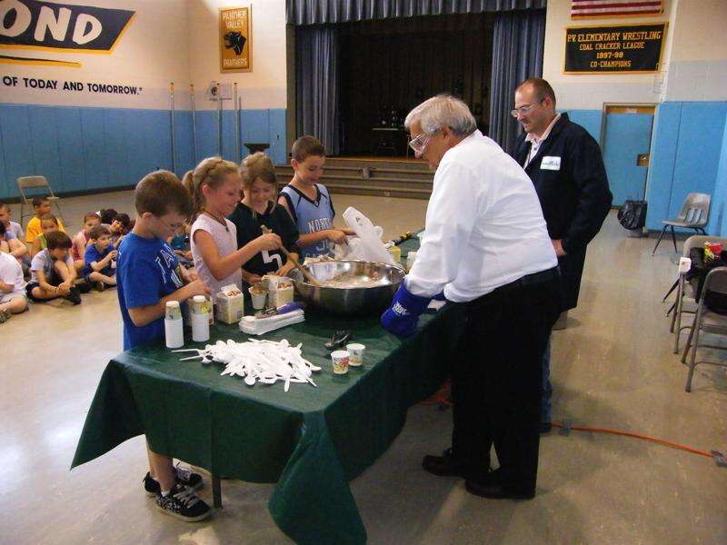 The incoming fourth graders each year are treated to a one-week long class in science at Panther Valley Elementary School in a program sponsored by the Panther Valley Foundation Science Camp. This year the 43 students were given experiments to work on by teachers Krista Dunbar and Mindy Penberth. Each child received a free t-shirt and learns some interesting things in science. Making Oreo ice cream above are Jaimeson Tice-Domines, Hailey Lynn, Emily Lehman, and Trey Turner. Looking on are Air Products employees Chris Misstishin, shipping supervisor and Tom Cara (front) the LIN Ambassador and draftsman. At right, Mark Kokinda samples the Oreo ice cream made by his classmates. Most students ate second helpings of the ice cream after making a second batch. The recipe calls for mixing 1/2 cup sugar, 1 pint heavy whipping cream, 1 pint Half and Half, 1 small container Egg Beater liquid mixture, squirt of vanilla and about 5liters of LIN for 3 batches. Oreo crunchies were added last before stirring.