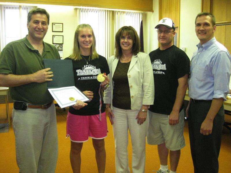 Tamaqua Area High School student Allison Updike received accolades for her recent accomplishments at the state track meet, including the championship in the javelin.Community volunteer Andy Leibenguth was presented with a certificate honoring his tireless efforts on behalf of several organizations and the community."People have a negative perception that there are a lot of bad things going on in our community," said council president Micah Gursky. "Andy and Allison are certainly two good examples of the good things that are going on in our community."In other business, council approved the location of the monitoring and hardware storage area for the police security camera project to be in the old district magistrate's office on the second floor of the borough hall. Additionally, a room currently being utilized by the police to store evidence will need to be vacated.Councilman John Trudich said that ideally, an extension could be built on to the existing police department that would allow the department better access to the equipment, but due to the time constraints on the project, the other area must be utilized immediately.Trudich added that if in the future, the camera project expands, more room will be needed to house the equipment.Council approved two handicap parking spaces, one at 210 Orwigsburg Street and another at 553 Arlington Street.Council adopted a resolution authorizing the submission of an application for funding in the amount of $390,000 for the rehabilitation of 420 East Broad Street, as well as a cooperation agreement with the Alliance for Building Communities for the rehab project.ABC intends to convert the building at 420 East Broad Street, which is also known as the Akins building, into multi-unit housing.Dennis Kiefer, the president of the Schuylkill County Building and Truck Trade Council, asked that the borough consider a project labor agreement for the Owl Creek Reservoir renovation project. Kiefer explained that a similar agreement had been put in place for the transportation station project in Pottsville and resulted in approximately 75 percent of the workers on the site being craftsmen from Schuylkill County. Council asked for a copy of the type of agreement, which Kiefer said he would provide.Council received communication from the borough's engineering firm, Alfred Benesch and Company, Pottsville, regarding the intake tower located at Owl Creek Dam's upper reservoir.According to the communication, the engineer is recommending that the existing tower be removed, because it will not be functional.Gursky added that there were some "broken hearts" with the Owl Creek Reservoir Commission about the removal of the historic structure."In order to save the reservoir, we're going to have to get rid of that," he said.Council members discussed the possibility of removing it and relocating it, however, it would ultimately be up to the reservoir commission to make a recommendation and undertake the project. A motion to approve the engineer's recommendation died for lack of a second.Gursky also reminded residents that WNEP's Joe Snedecker will be stopping in Tamaqua at the Train Station during his annual bike tour fundraiser in July. Gursky asked residents to get out and support both Snedecker and the town.
