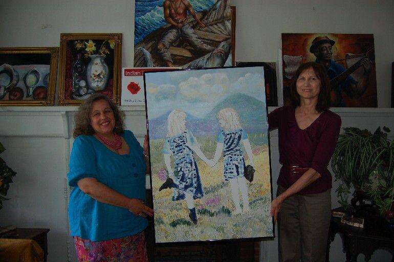 KAREN CIMMS/TIMES NEWS Alessandra Crum, left, and Elda Walsh, with one of Walsh's acrylics. This and some of the other work pictured will be featured in The Rose Room Art Exhibit at the Albright Mansion Restaurant in Jim Thorpe this weekend.