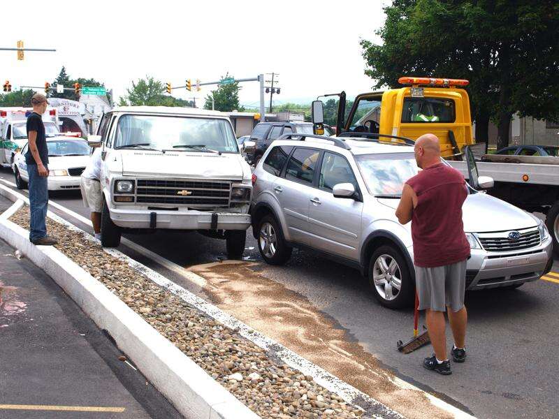Traffic on SR309 in Hometown was affected starting at about 12:30 Sunday afternoon as emergency personnel were called to a two-vehicle accident that occurred next to the Beacon Diner. A white van rear-ended a gray SUV while trying to avoid it and ended up on the newly built street curb built next to the diner. Volunteer firefighters cleaned up the fluids that were coming from the van. Rush Township police, Hometown Fire Company, fire rescue, fire police, and Quakake rescue responded. No one appeared seriously injured.