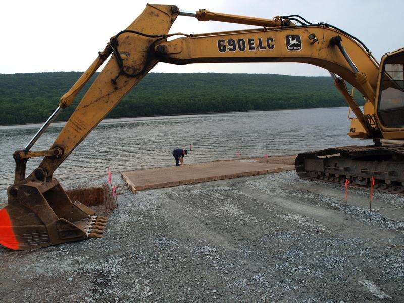 Rob Herschell of the PA Fish & Boat Commission checks the first of three concrete slabs that will be pushed into Mauch Chunk Lake to provide boat launch access at the park's Boat Launches A & B. The boat launches are expected to be completed by the end of July.