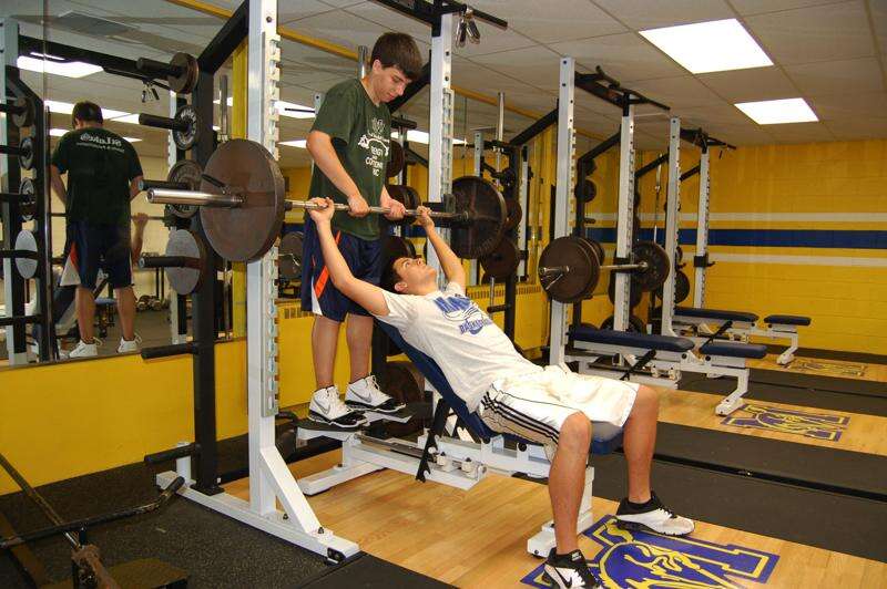 CHRIS PARKER/TIMES NEWS Marian High School students Ryan Karnish, standing, and John Julian, lifting, work out on new equipment purchased for the Dr. David J. Newton Fitness/Wellness Center at the school.