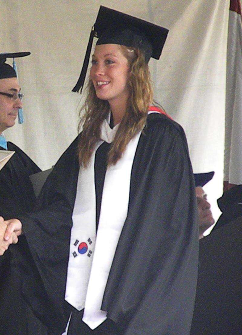While at Arcadia which she chose for its reputation for international study abroad, she studied in London's City University, the same school Tony Blair attended, and while there was assigned as an ambassador for the school as an American student. She also visited many countries including Austria, Serbia, Hungary, Greece, Germany, Brussels, Croatia, Czech Republic, and Slovakia, to name a few.She spent a summer in Mexico building homes for the needy on a volunteer program through Arcadia.She also studied in her second year of studies, in South Korea and again was asked to be an American ambassador to American Dignitaries who attended the prestigious Woman's University EWHA, the school she attended while there. The program was in inclusive program designed to learn the language while studying abroad.While in Korea she visited Vietnam, Cambodia and the Philippines.While in the states and on campus, she also started on the volleyball team at Arcadia.She is currently living with her husband, who is in the Marines in North Carolina, and plans on continuing her education in graduate school in the field of international studies/securities and intelligenceShe is a 2007 graduate of Jim Thorpe High School.