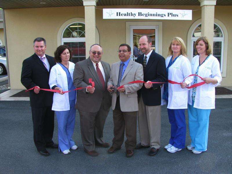 Healthy Beginnings Plus, a comprehensive prenatal care program of Hazleton General Hospital, has opened a clinic on Route 309 in Hometown, inside the ExcelCare Pain Management Center office building. Participating in the ribbon-cutting ceremony on Wednesday were: (l-r) Michael Golden, HGH Chief Nursing Officer; Cindy Corrado, RN, HBP nurse; James Caggiano, MD, Pediatrician with Pediatric Associates of Hazleton; Farag Salama, MD, and Scott Muir, DO, HBP OB/GYN physicians, Susie Lombardo, RN, HBP Care Coordinator and Practice Manager; Kathy Markle, RN, HBP nurse. The clinic is open Wednesdays and Fridays. Appointments can be made by calling 668-3898 Monday through Friday