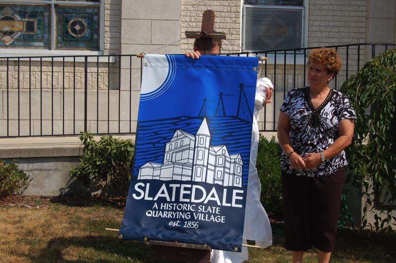 Northern Lehigh Future Focus held a news conference on Tuesday in front of the Salem United Methodist Church in Slatedale to unveil the banners.The 12 30-inch by 48-inch double-sided banners depict a large Victorian House below a slate bank and derricks, and include writing that says "Slatedale A Historic Slate Quarrying Village, est. 1856."Designed by former Kutztown University communication design student Sean Allison, the banners are based on Slatedale's slate industry and Victorian architecture.The banners were funded through a grant from the Lehigh Valley Chamber of Commerce Foundation, and a local Adopt a Banner Program held in the township. Additional monies were secured from the township and NLFF, which coordinated the project.Robert Stettner, a member of NLFF, noted how the village was a "key player in the local slate industry.""These banners will beautify the village of Slatedale," Stettner said. "This is a close-knit community that takes pride in how their homes look, and these banners will help add to it."Stettner said the banners will be hung on light poles throughout the village.Josh Friebolin, chairman of the Washington Township board of supervisors, said the township will maintain the banners, which will be displayed from spring through fall."They look great, and should make an already pretty village even prettier," Friebolin said. "I hope that you feel these banners will enhance the village of Slatedale."Ellie Passman Hock, of the Greater Lehigh Valley Chamber of Commerce, presented a check in the amount of $1,000 to NLFF members."It's projects like these that we're so happy to fund," Hock said. "We hope this will help make Slatedale a destination for tourists and visitors to come."Stettner then thanked all those who played a role in the banners project.The first slate quarry in Slatedale, the Locke Quarry, was opened in 1848 by George and Nelson Larbar, Stettner said. Hard slate was found to be the best for roofing shingles, and, since Slatedale had an abundance of this hard type of slate, many slate quarries were opened and the village grew and prospered in the late 1800s and early 1900s, he said.The Crescent Slate Company was known for the manufacture of the federal government roofing slate, Stettner said. The slate roof on Independence Hall in Philadelphia and many other government buildings comes from Slatedale, he said. An extension of the Lehigh Valley Railroad from Slatington to Slatedale opened in 1870, making it easier for the western slate quarries to ship their products to market, Stettner said.Today, only the Penn Big Bed Slate Quarry remains in operation, he said. It still produces roofing slates, and a variety of other slate products such as blackboards, mantels, turkey calls and slate flooring.The NLFF is a Slatington-based community visioning group that serves the Northern Lehigh area. In April, the group unveiled new Main Street banners that were hung on light poles on the new General Morgan Bridge in Slatington.Funding for those bridge banners was made possible with a Street Amenities Grant from Lehigh County. Those banners were designed by local artist Patrick Bechtel of Slatington, and are based on old school slates.The 16 24-inch by 18-inch double sided banners depict a school slate, as well as the writing on the "slate portion" with the words "Slatington established in 1864," the year of Slatington's inception. Also, the words "Blackboard capital of America" are included, which is a nod to Slatington's one time distinction of producing more school slates and blackboards at the height of the local slate industry than anywhere in the country.Previous banners were erected along Main Street in 2004, in recognition of Slatington's National Register Historic District, and to welcome people to the borough.