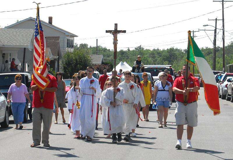Anthony Collevecchio of Summit Hill carries a cross during the first St. Gabriel procession, in conjunction with the St. Joseph Parish Festival, in Summit Hill on Sunday. In the background is the statue of St. Gabriel, which was placed on the back of a pick-up truck for the parade. St. Gabriel's Church in Summit Hill was closed two years ago and the congregation merged with St. Joseph's.