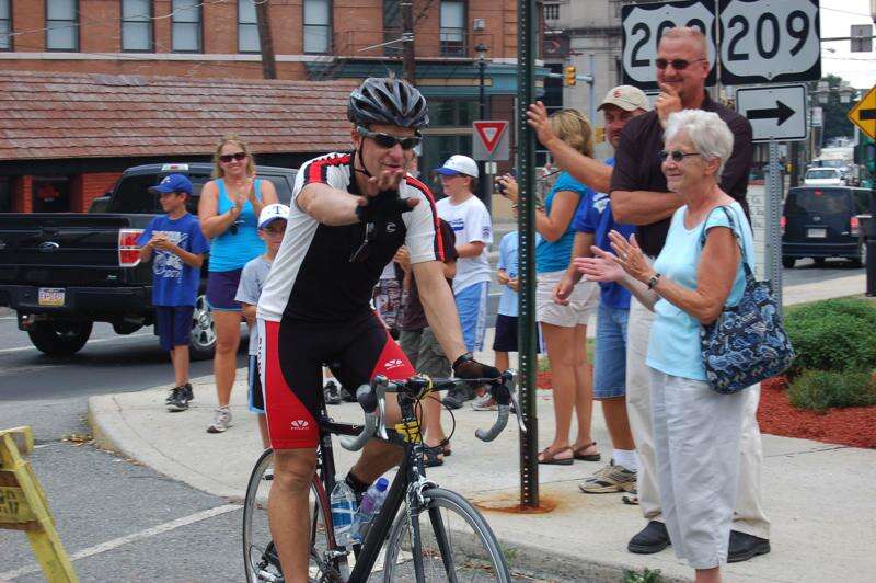 The annual fundraising bicycle tour of WNEP Channel 16 morning meteorologist Joe Snedeker rode across Schuylkill and Carbon counties on the third day of his trek, and a throng of hundreds greeted him during his officially scheduled stop at Depot Square Park, at the Five Points Intersection of state routes 209 and 309.This is the 13th year for Snedeker's bike tour, which raises funds for St. Joseph's Center for severally mentally and physically handicapped children and young adults in Dunmore.The tour organizers had scheduled Tamaqua as a stop for its noontime news broadcast. Snedeker was preceded in Tamaqua by an RV and a WNEP mobile unit in order to televise his visit live.Snedeker began his Wednesday journey in Pine Grove, leaving at 8 a.m. He pedaled the approximately 40 miles to Tamaqua, eventually moving onto SR209 and riding through Middleport, Brockton, Tuscarora, Reevesdale and Newkirk before hitting Broad Street in Tamaqua.By the time Snedeker's bike arrived at Depot Square at 12:06 p.m. the WNEP noon newscast was already underway and Snedeker made his way through the crowd in order to do his on-air actuality.The midday temperatures were once again scorching, but Snedeker made light of the heat. "I wish it were hotter. Sunnier would be great," quipped the weatherman. "We need more heat. I'm ready for a big bonfire."Among those greating Snedeker were the Tamaqua Knee-Hi Cheerleaders, who led a "Go Joe" cheer for him.As the purpose of Snedeker's trek is to raise funds for St. Joseph's, he was presented with checks from a number of Tamaqua area organizations, as well a jar of pennies. A water jug of bills which was collected at the park.State Senator David Argall (R-29) and State Representative Jerry Knowles (R-124) turned out to present Snedeker with citations from the Senate and House of Representatives.Linda Yulanavage, executive director of the Tamaqua Area Chamber of Commerce, which helped publicize Snedeker's stop, mentioned a few more donations.Nancy and Rachael Paisley presented Snedeker with a check for $432.20 on behalf of Girl Scout Troop 1211, which placed 35 canisters in various businesses and locations in the community.The Tamaqua Hi-Rise Tenants Association presented him with a check for $250.The Tamaqua LEO Club gave him a plaque, making him an honorary member, as well as a check for $50.Joe Pilla, owner of Skipper Dippers in Ginthers, gave Snedeker a milk crate with eight of his Go Joe milkshakes, which combine peanut butter, bananas and vanilla no fat/no sugar yogurt. The proceeds from the sales of the shakes, as well as a special that included selling cheesestakes named for another WNEP weatherman, Kurt Aaron, were also presented to Snedeker in the form of a check for $800.Snedeker also received a check for $203 from the owners and patrons of The Restaurant at The Station, where he and his crew ate lunch. On the menu for the day: Go Joe Buffalo Pierogies.After his Tamaqua stop, Snedeker continued on 209 through Coaldale, Lansford and Nesquehoning and up SR93 to Hudsondale, then through Weatherly and White Haven to the completion of this phase of the trip at Mountaintop.