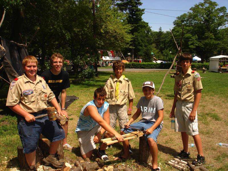 Left to right: Boy Scouts from Troop 20 Jesse Schneck, Robert Keyser, Mike Sanders, Toby Sanders, and Nick Sanders show William Lowe (second from the right) how to make his own wooden mallet at the 100th anniversary of Boy Scouts of America Jamboree in the Palmerton Borough Park. Lowe a 2-year Webelos, along with his family, were visiting in the area from Army Base USAG-Yongson in Seoul South Korea. Some of the other activities the public was invited to participated in were the Tomahawk Throw, carving arrow heads, walking across a monkey bridge and climbing a homemade bridge. Approximately 30 scouts and 18 leaders from Boy Scout Troops 41, 21, and Towamensing Boy Scout Troop 209 organized and took part in the weekend campout celebration.