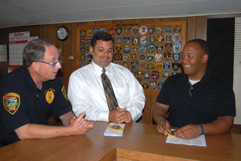 Mahoning Township Chief of Police Kenneth Barnes, left, talks with new part-time officers hired in the township, Elliott Miller, center, and Richton Penn. The officers will begin patrolling on August 1. The new patrolmen were sworn-in by John Wyczorek, chairman of the Mahoning Township Board of Supervisors.