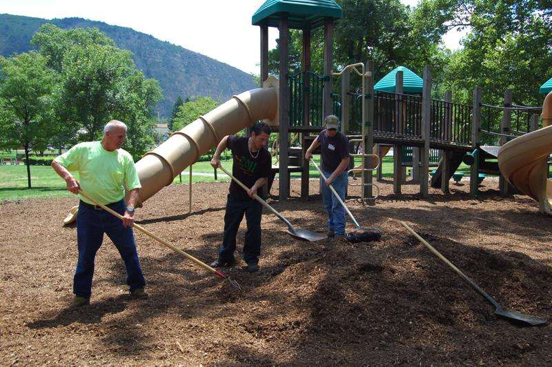 Left to right: On a beautiful sunny summer day, Donald Knappenberger, Andrew Bartholomew and Walter Haas, Jr. of the Palmerton Borough, rake a tractor trailer load of fresh mulch in the playground of the Palmerton Borough Park to make it a safe and soft playing area for the children.