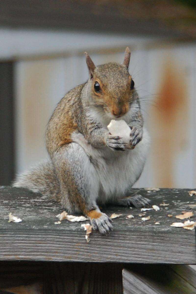 Talk about your messy eaters! This little furry woodland creature drops quite a few crumbs as it polishes off its meal on a deck railing in Jim Thorpe on Monday afternoon. The squirrel showed little fear as the photo-grapher snapped his picture.
