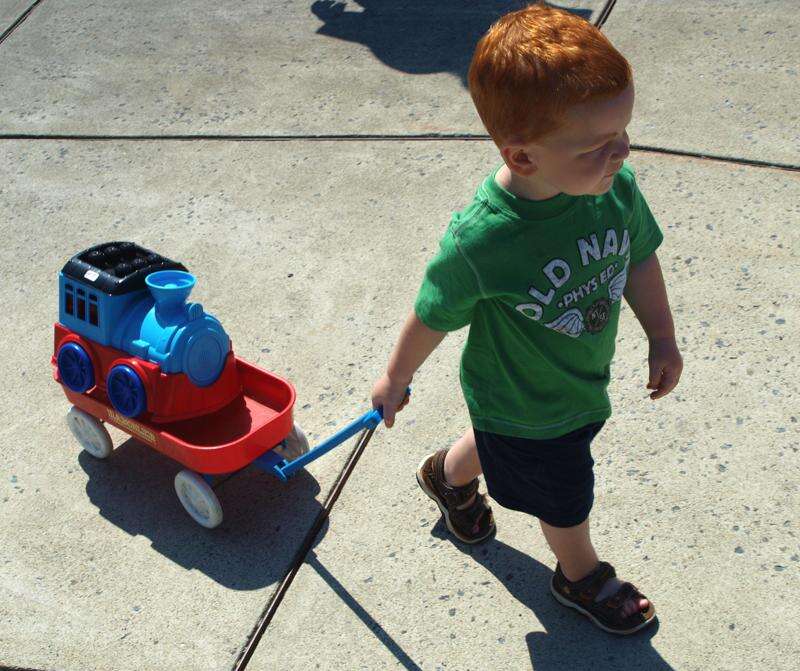 ANDREW LEIBENGUTH/SPECIAL TO THE TIMES NEWS Teegan Phillips, 2, pulls a toy train his parents, Timmy and Megan Phillips, bought him while shopping downtown during the Tamaqua 9th Annual Community-Wide Yard and Sidewalk Sale held recently via the Tamaqua Chamber of Commerce.
