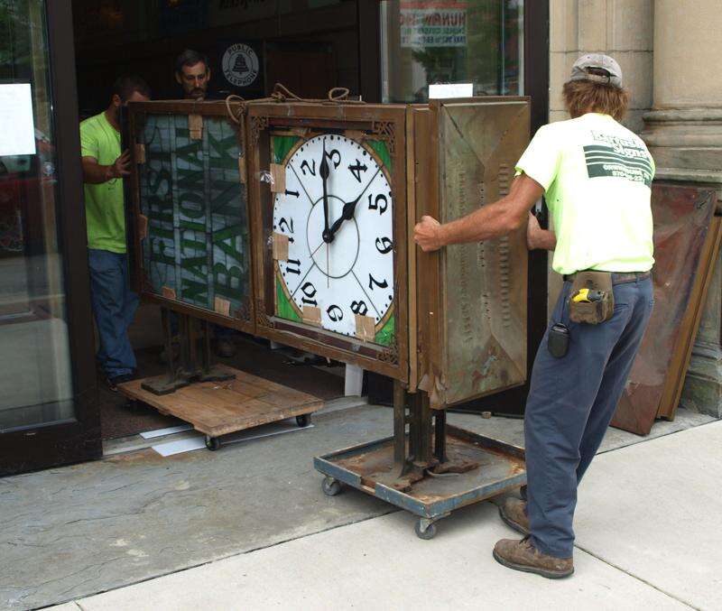 Workers arrived at the Tamaqua Historical Society Museum late last week to pick up a large antique stained-glass clock sign which the Tamaqua Historical Society is sending out to be fully restored by Bartush Signs of Orwigsburg.