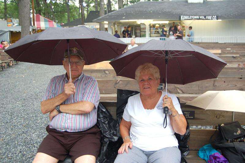 LINDA KOEHLER/TIMES NEWS Harold and Mary Fehr of Bloomsbury, New Jersey have been coming to the West End Fair for the last five years and they come every day, even in the rain. "Rain doesn't matter much," they said as they sat and listened to Eva perform on the Main Stage in the rain, shielded with their umbrellas. "We love the shows." And the horses, and the circus and the food. They arrived for the fair when the gates opened at 10 a.m. and they planned on staying for the fireworks.