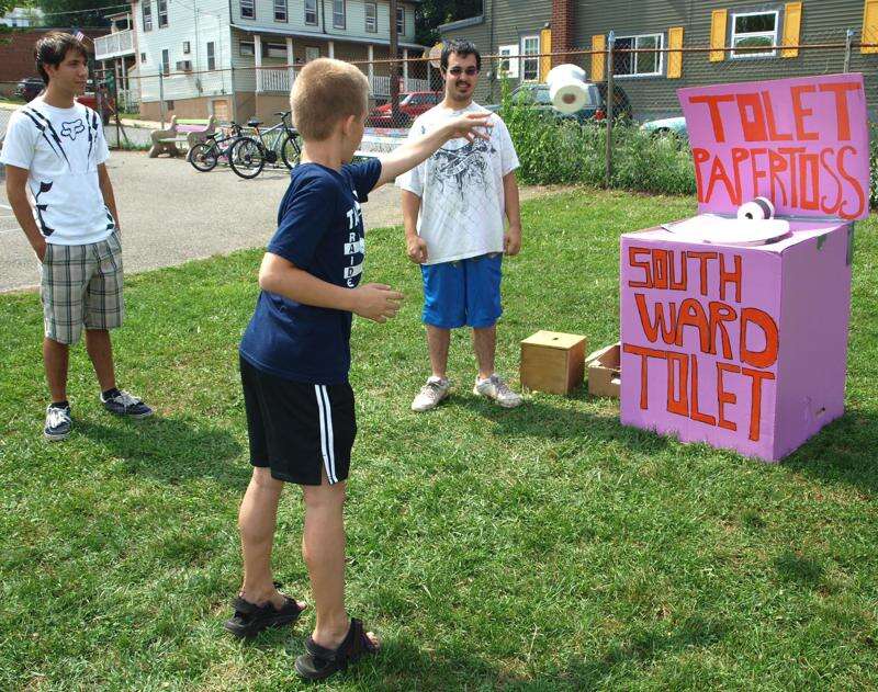 The South Ward Playground Association of Tamaqua hosted a free community and children's Fun Day recently. Hundreds of children with their families attended the fun event. The event included music, games, food, activities, inflatable bouncy gym, hair dying, and cotton candy. Left, taking part in the South Ward "Toilet" Paper Toss were Tyler Shilko, 10, center, and Fun Day volunteers Josh Nunemacher, 18, left, and Jeff Fetter, 18, on right. Right, both children and adults enjoyed themselves by spray painting their hair orange, green, pink, and blue.