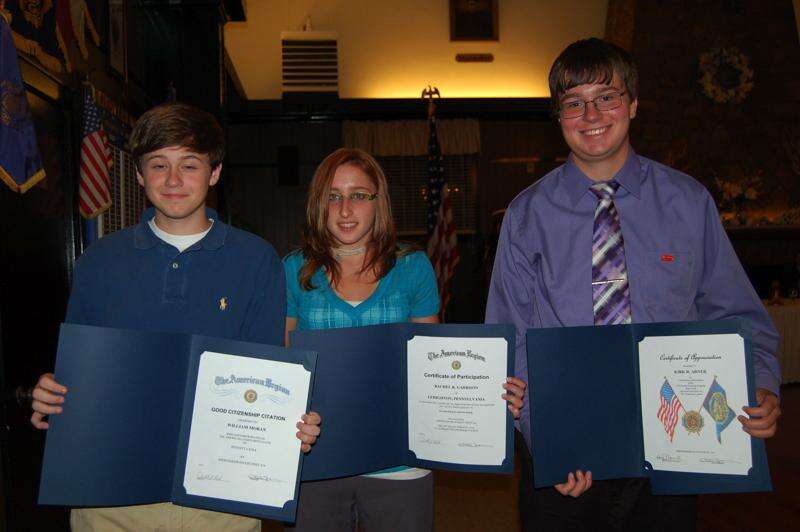 Three youths were presented certificates for participating in American Legion youth programs by Shoemaker-Haydt Post 314, Lehighton. From left are, Kirk Arner, Keystone Boys State participant; Rachel Garrison, center, attended State Police Youth Week; and William Moran, also a participant in Keystone Boys State. Arner is a senior at Lehighton Area High School. Garrison is a junior at Lehighton Area High School and Moran is a senior at Pocono Mountain East High School.